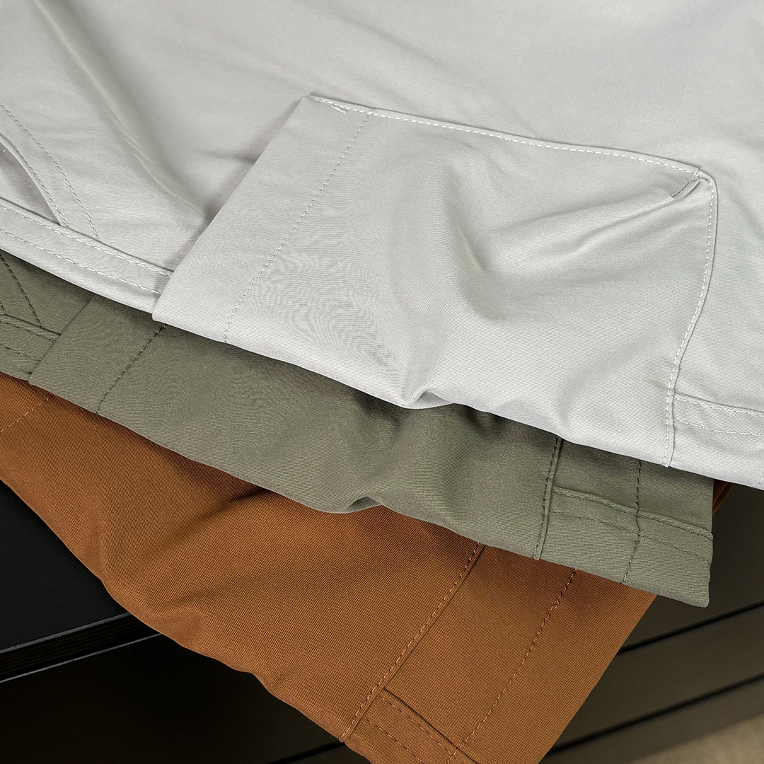 主要成分為棉,手感柔軟透氣,適合悶熱天氣穿著。布料微彈,兼顧活動舒適度與耐穿性。