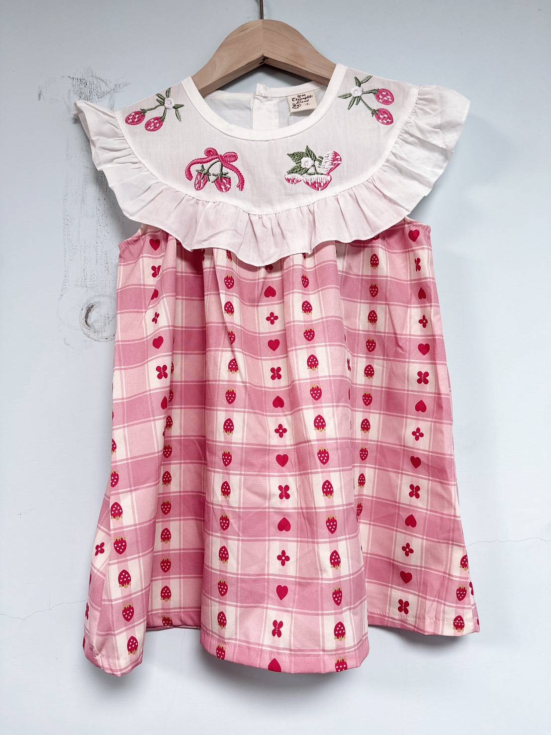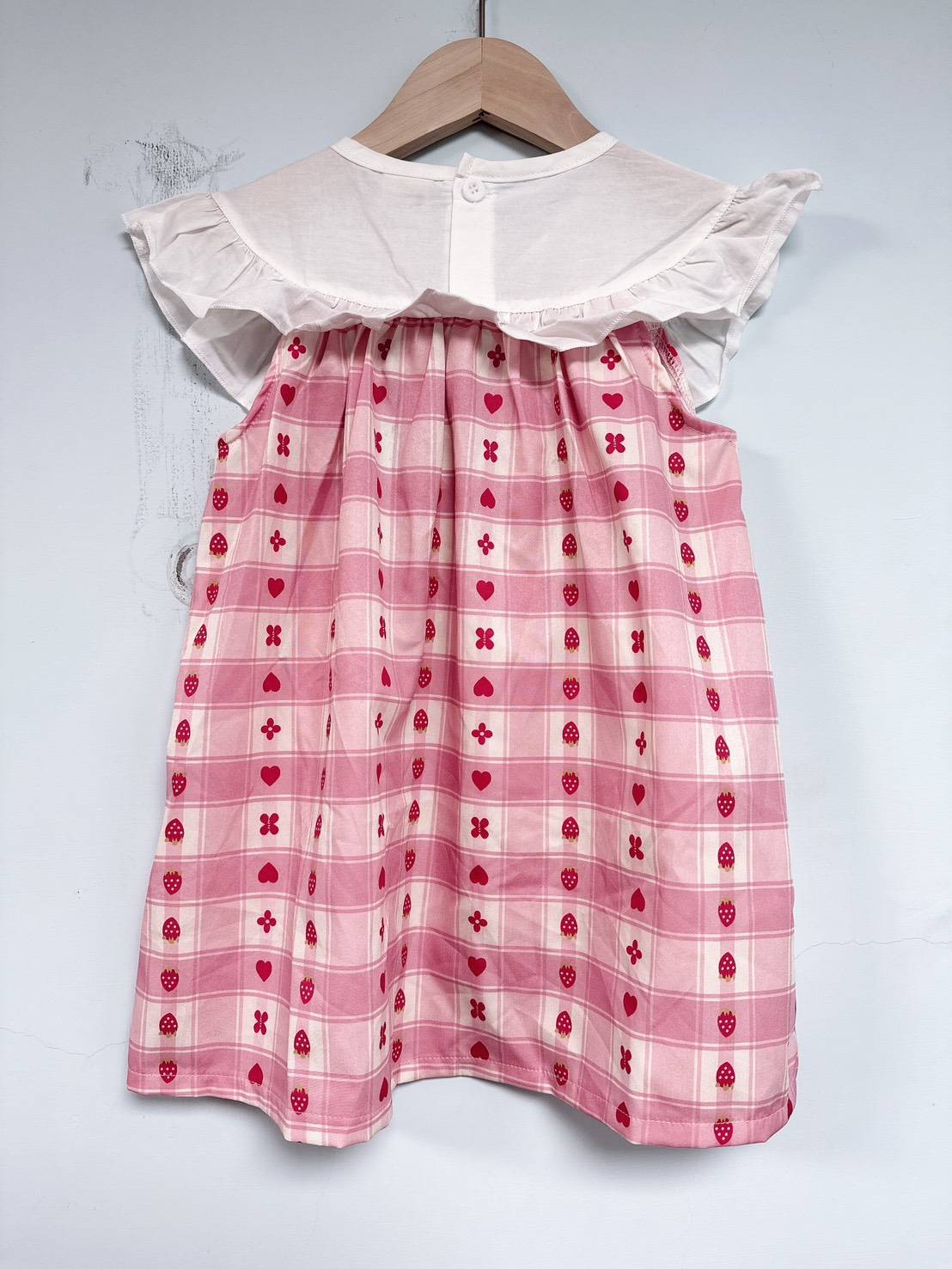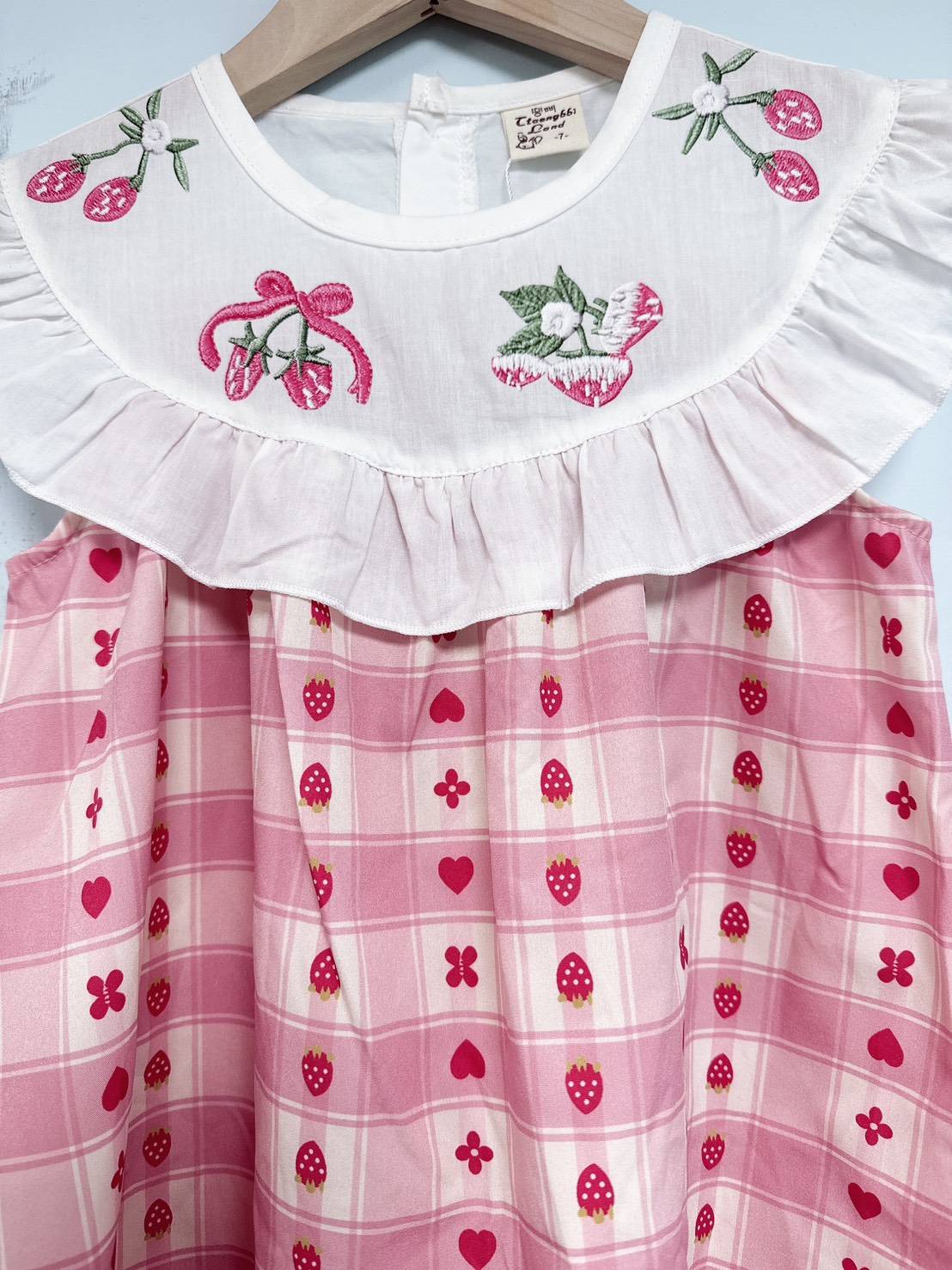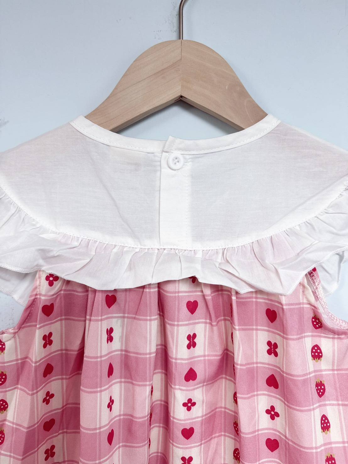 甜美草莓與愛心花朵印花點綴整件裙身,粉嫩格紋如糖果般可口