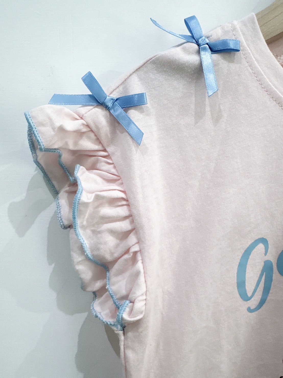 雙肩加上藍色蝴蝶結與荷葉袖設計,讓整體造型甜美升級!