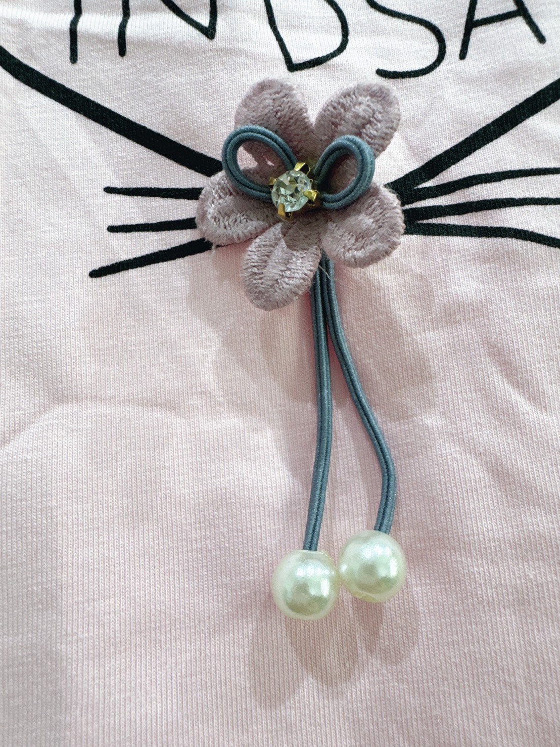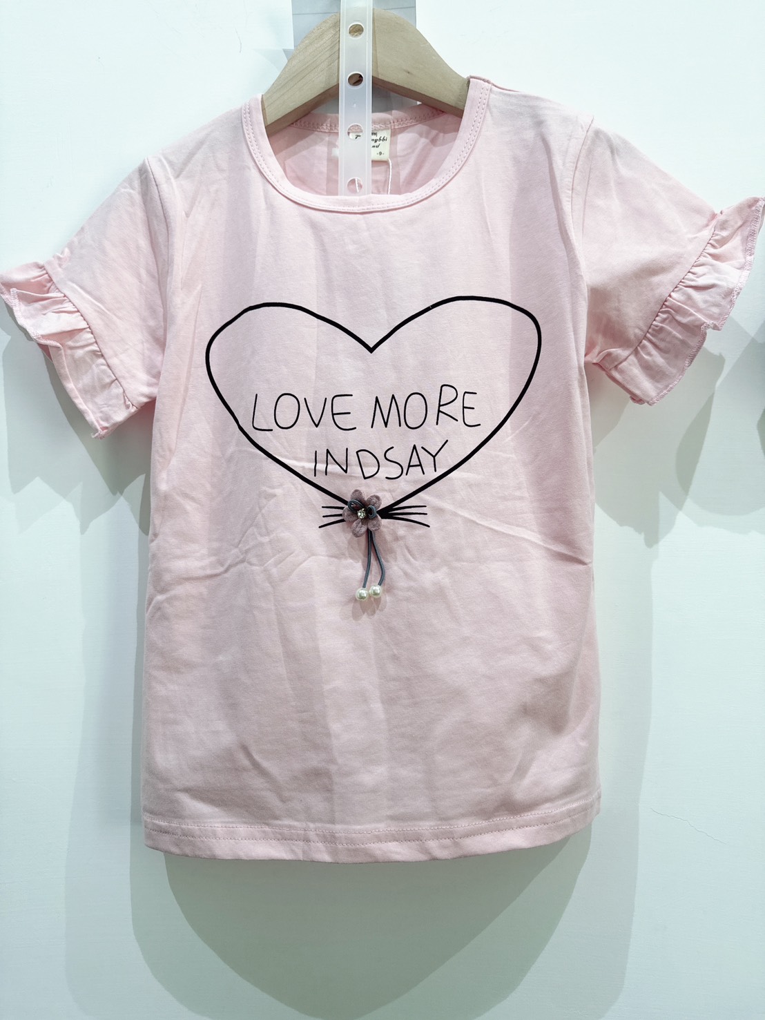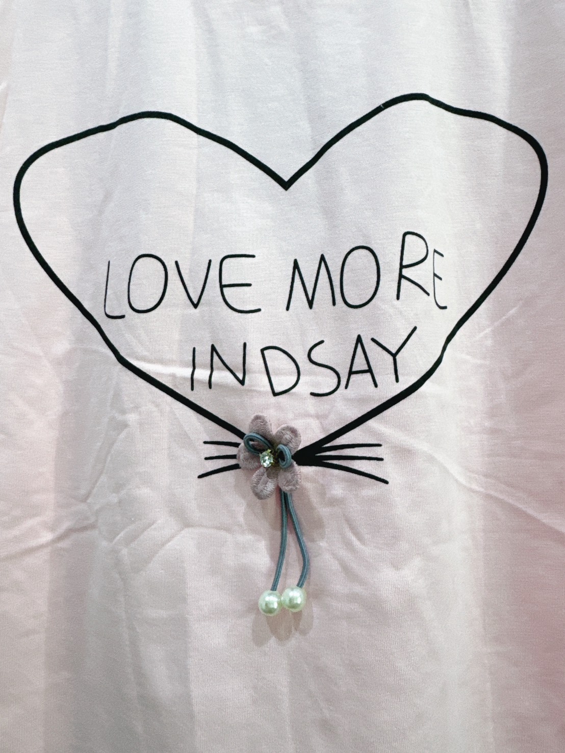 甜美嫩粉色搭配手繪風愛心字樣,胸前珍珠蝴蝶結點綴如貓鬍鬚般的小巧設計,為整體增添俏皮感。袖口荷葉邊設計讓女孩舉手投足更顯可愛,讓孩子在日常中也能感受到細膩的童趣時尚。