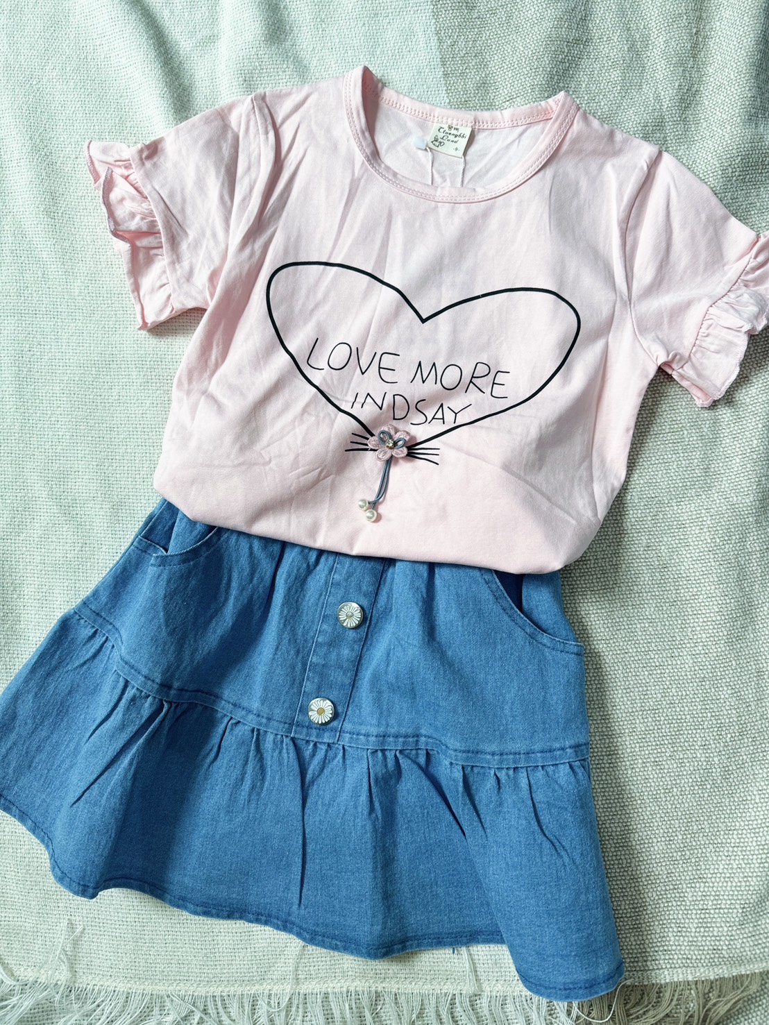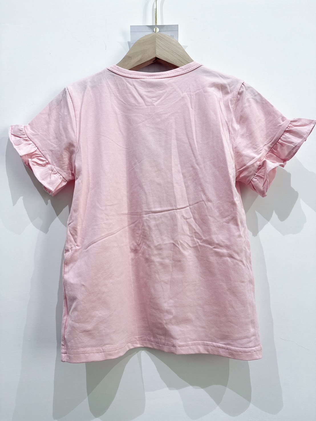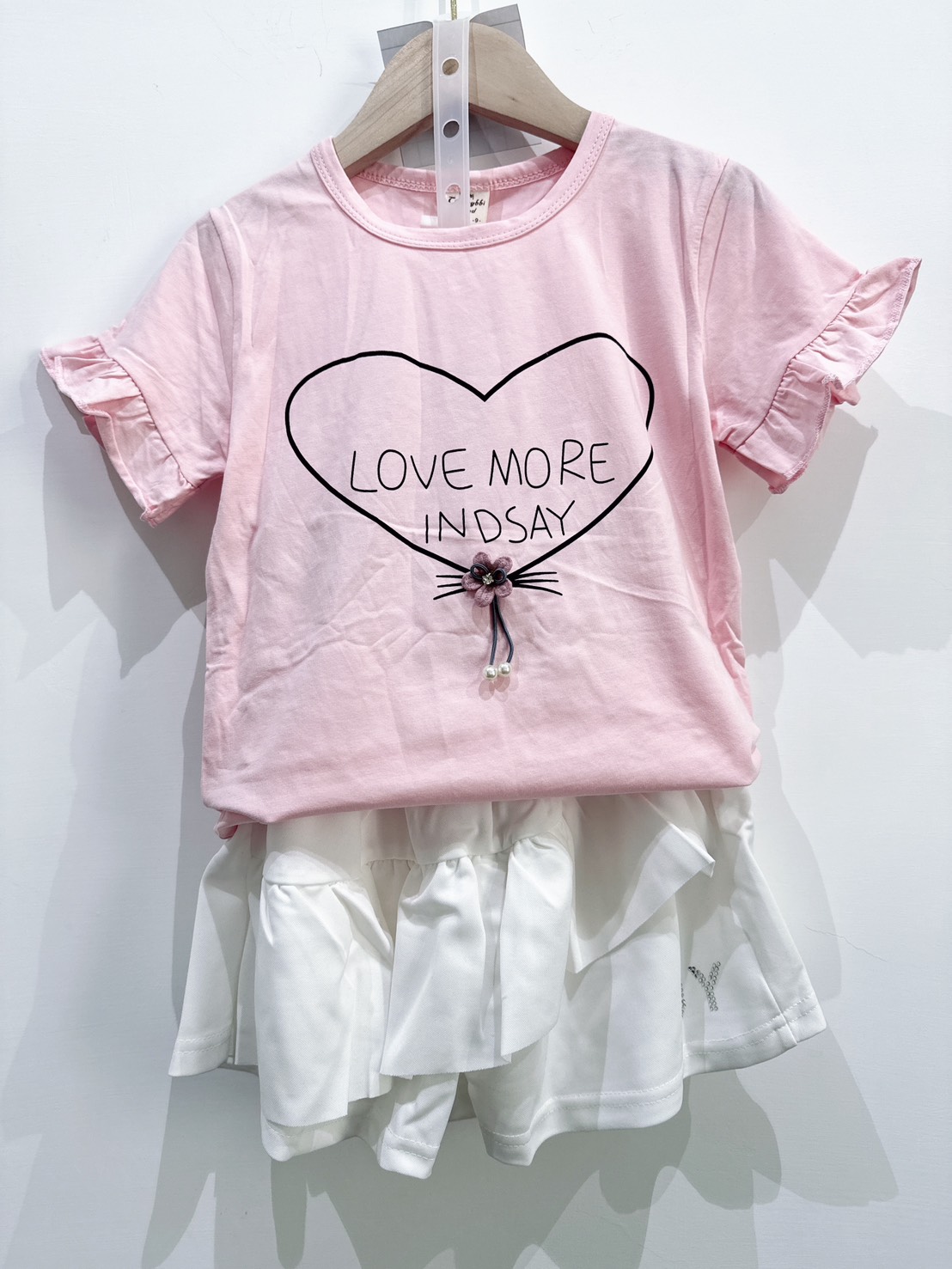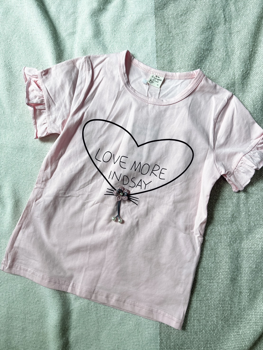甜美嫩粉色搭配手繪風愛心字樣,胸前珍珠蝴蝶結點綴如貓鬍鬚般的小巧設計,為整體增添俏皮感。袖口荷葉邊設計讓女孩舉手投足更顯可愛,讓孩子在日常中也能感受到細膩的童趣時尚。