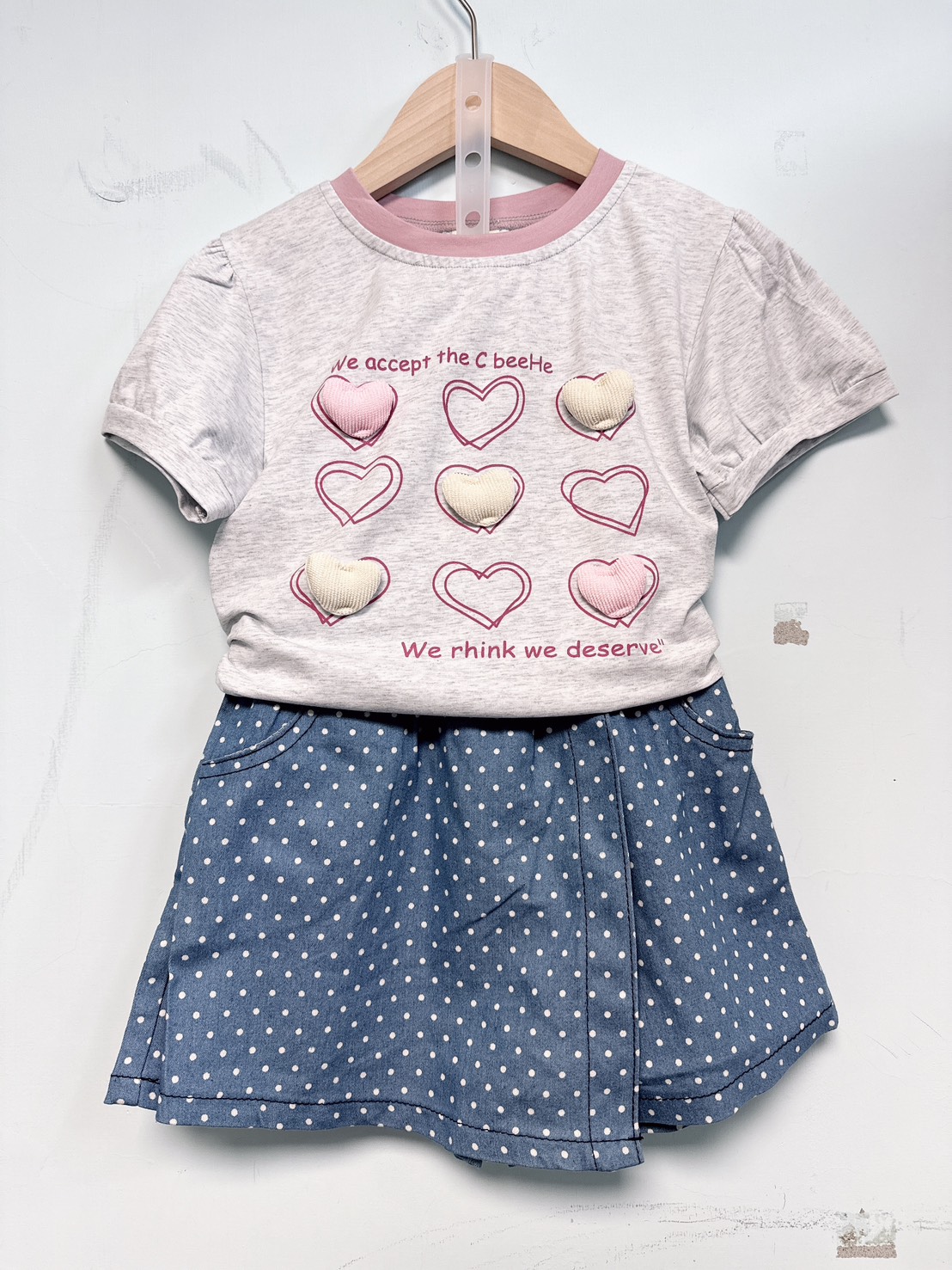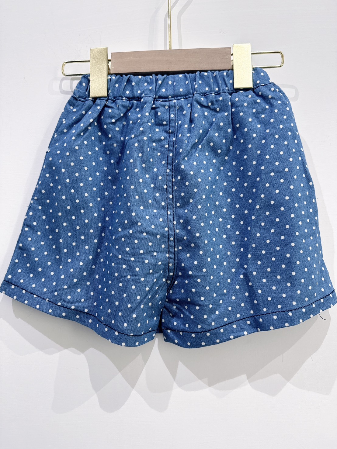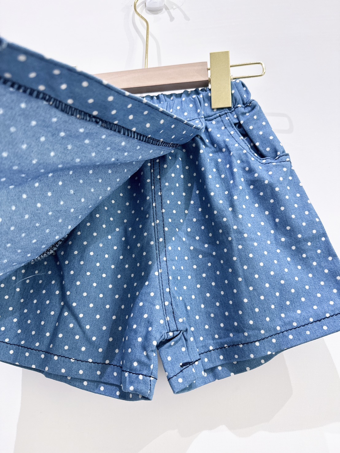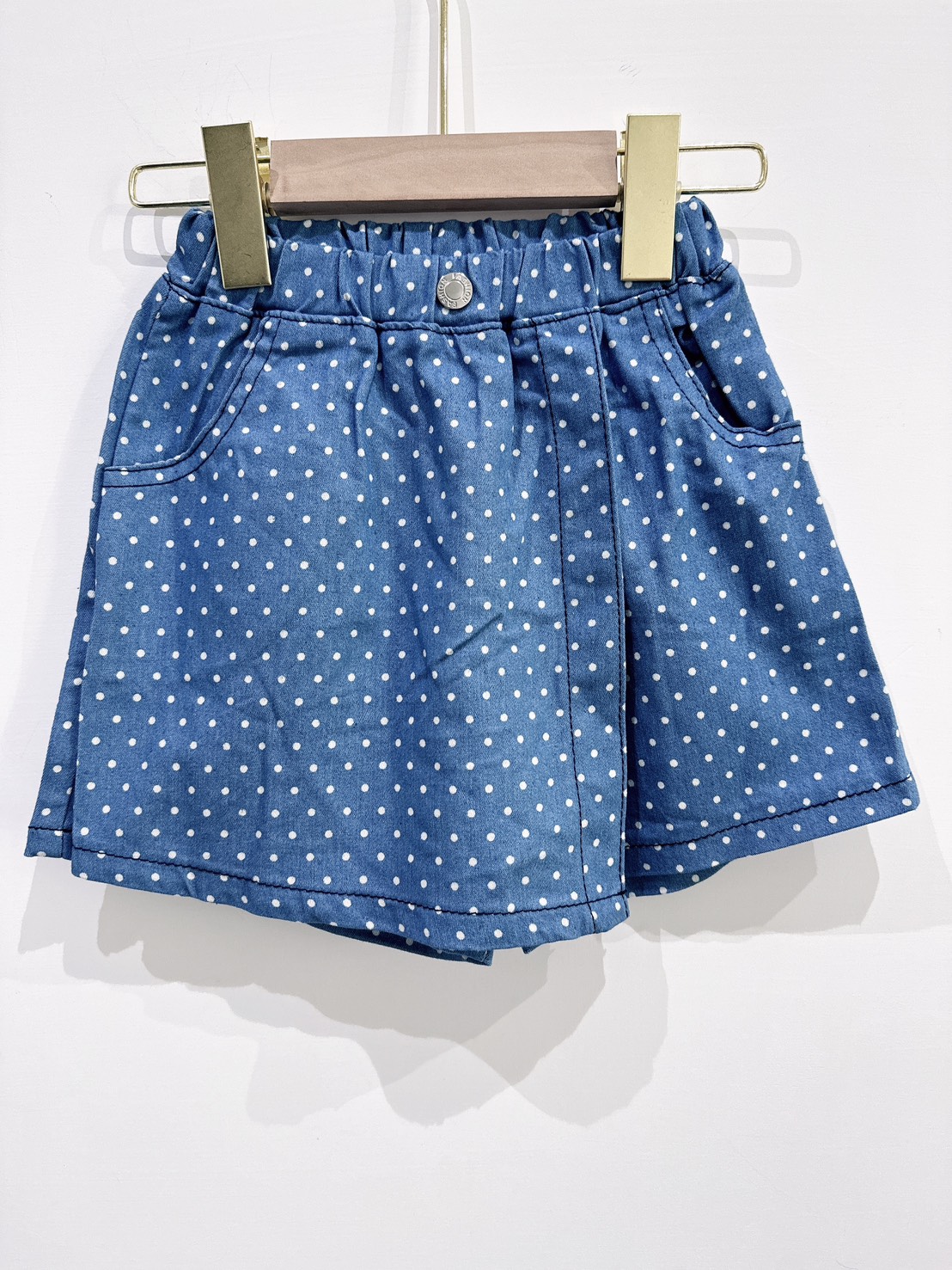 俏皮可愛的白色小波點搭配牛仔藍底,讓人一眼就愛上!褲頭彈性設計,穿脫方便,實用口袋設計也深得爸媽喜愛~小女孩夏日必備百搭款,單穿或搭配T恤都很有型!